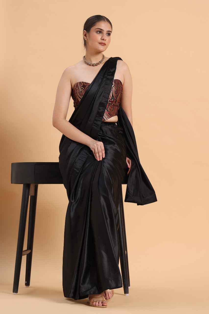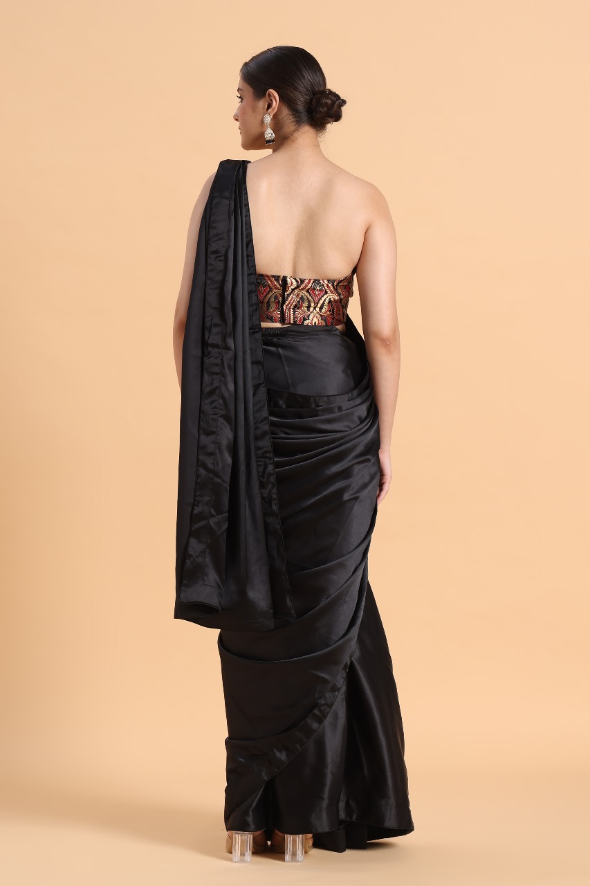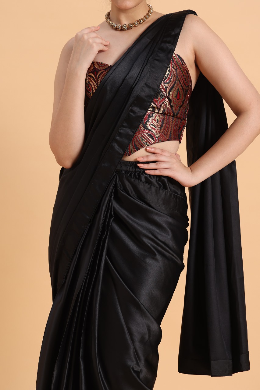 Black Satin Pre-Draped Saree with Banarasi Corset Blouse