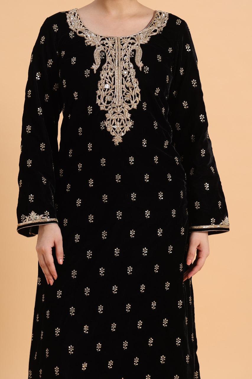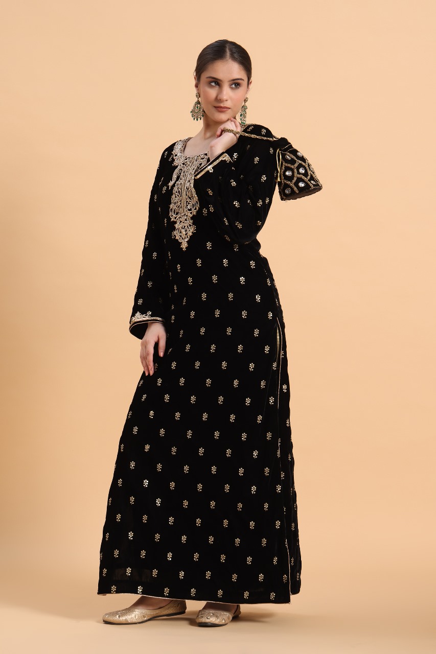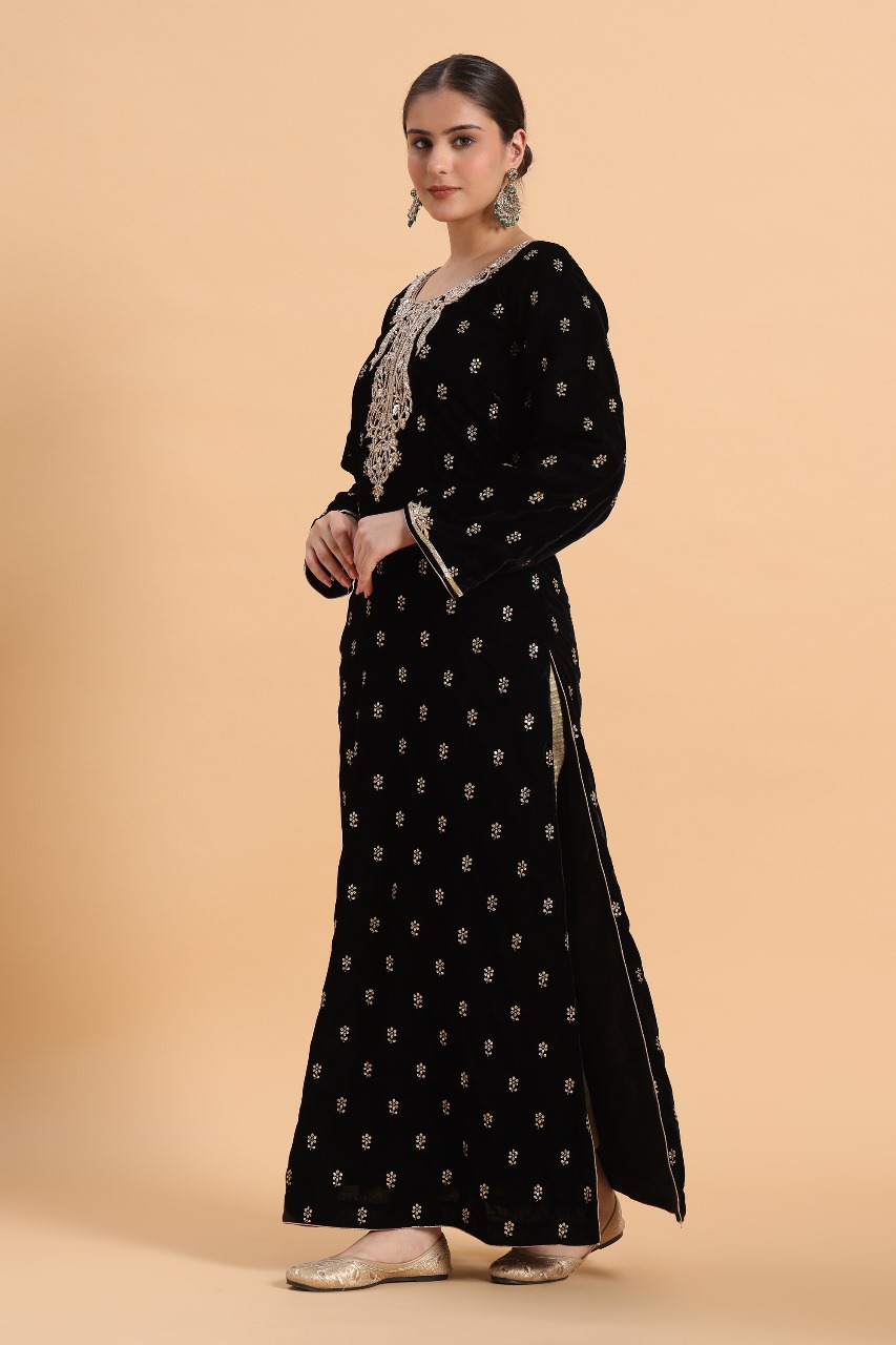Step into timeless elegance with this luxurious Black Velvet Kaftan, beautifully adorned with intricate zardosi work. Crafted from plush, high-quality velvet fabric, this kaftan drapes gracefully, offering both comfort and sophistication.