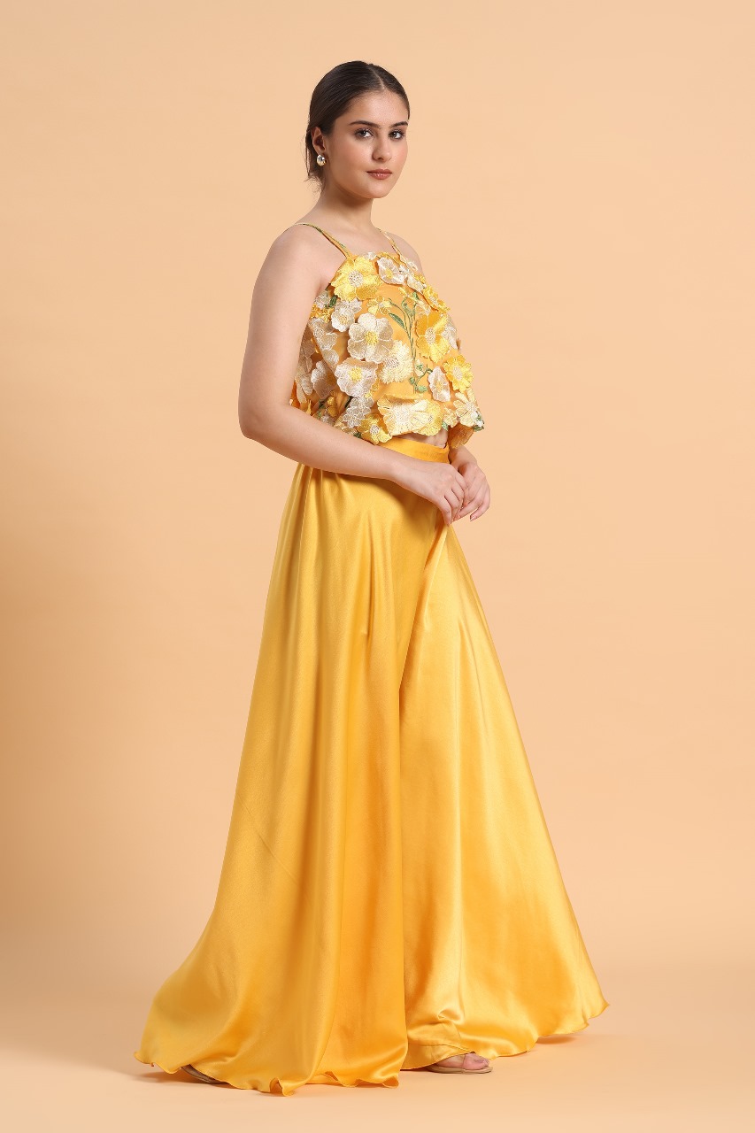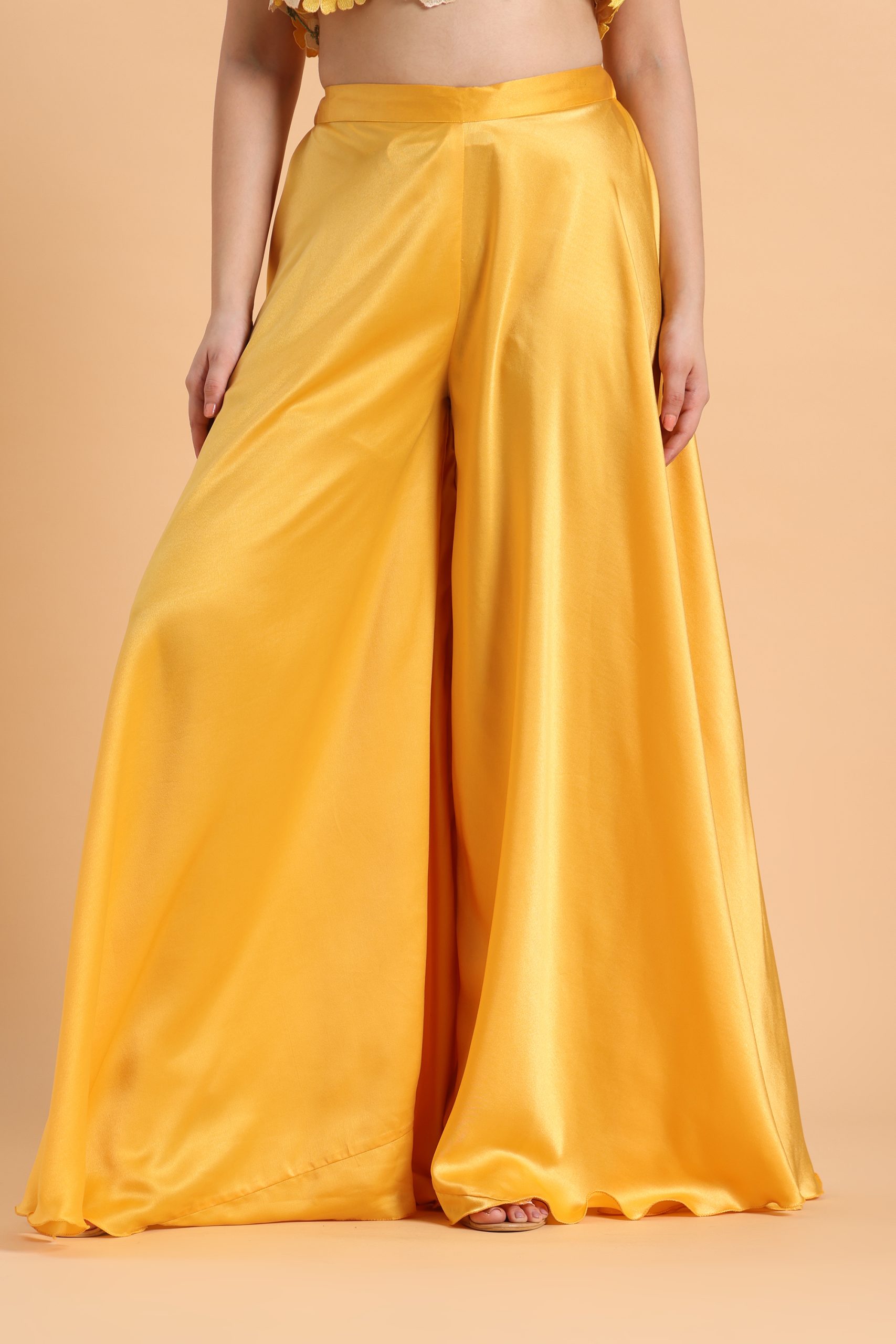 Yellow Net-on-Satin Floral Top with Flowy Satin Pants
